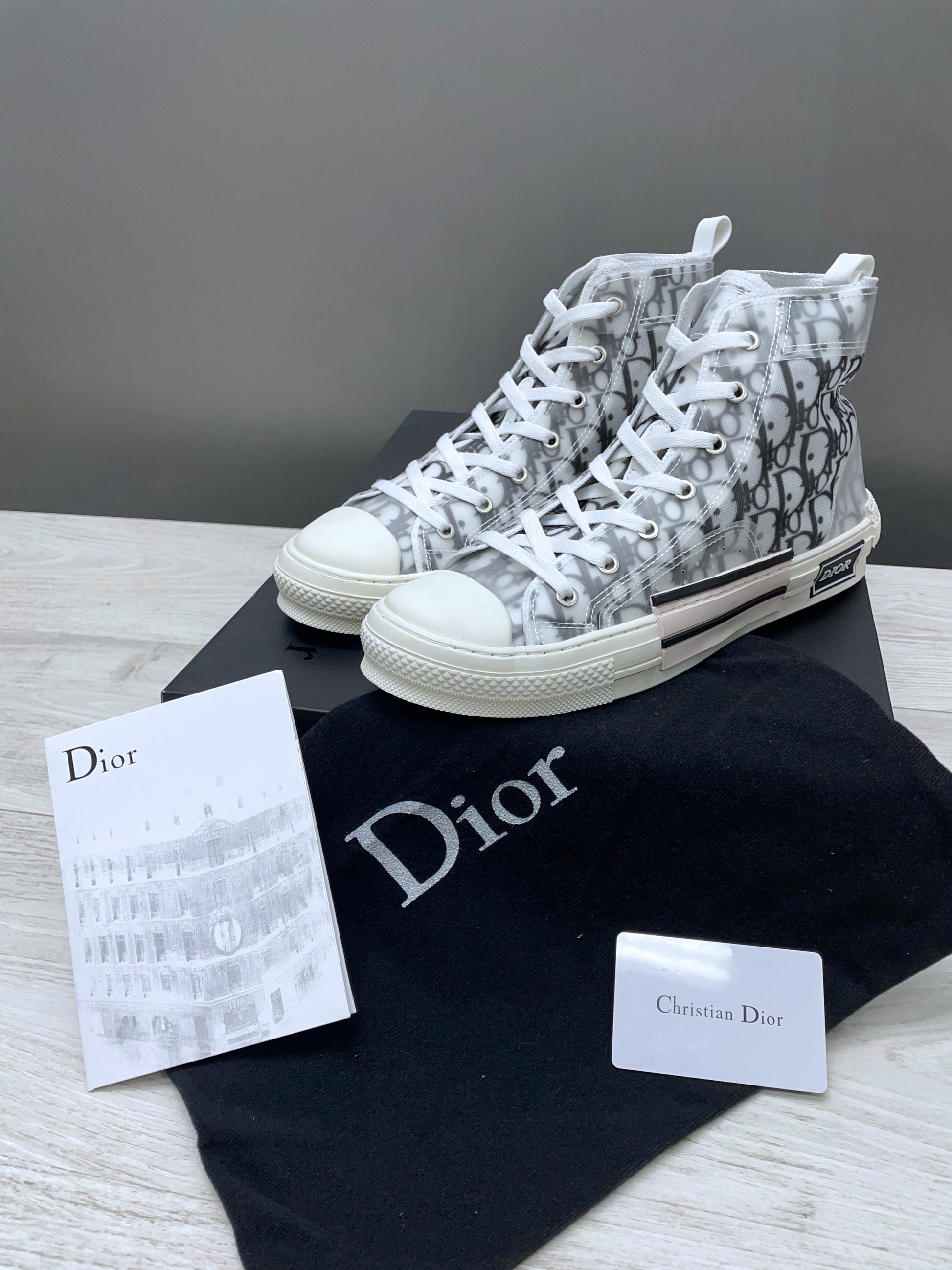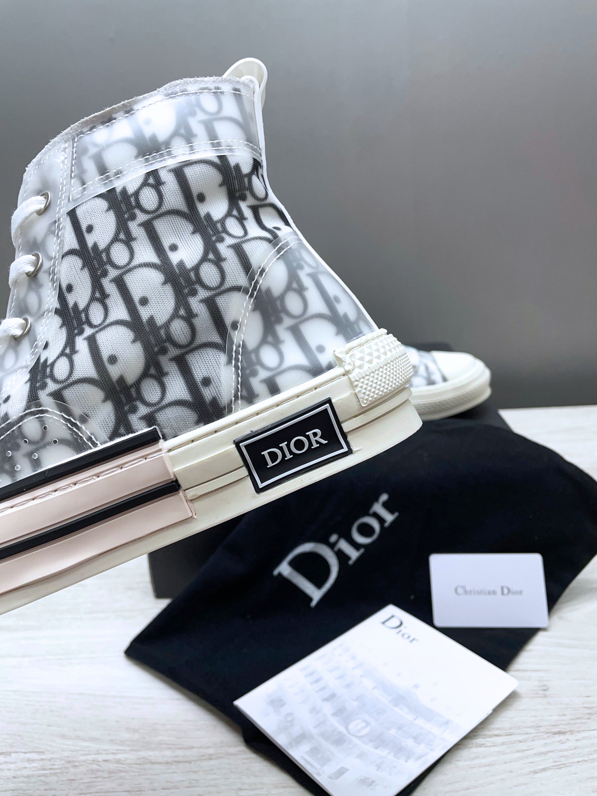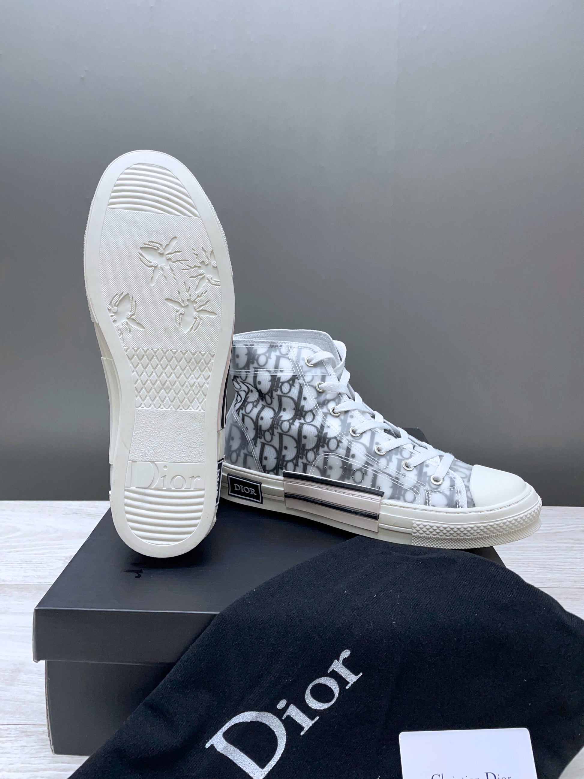 Zapatillas estilo bota, presume de ser ligero y cómodo con un tejido impermeable en color blanco y negro con el logotipo de la marca en estilo Monogram. Cordones de cierre planos con ojales de color plata. Suela de goma en color blanco sobre la que está estampada la firma Dior.