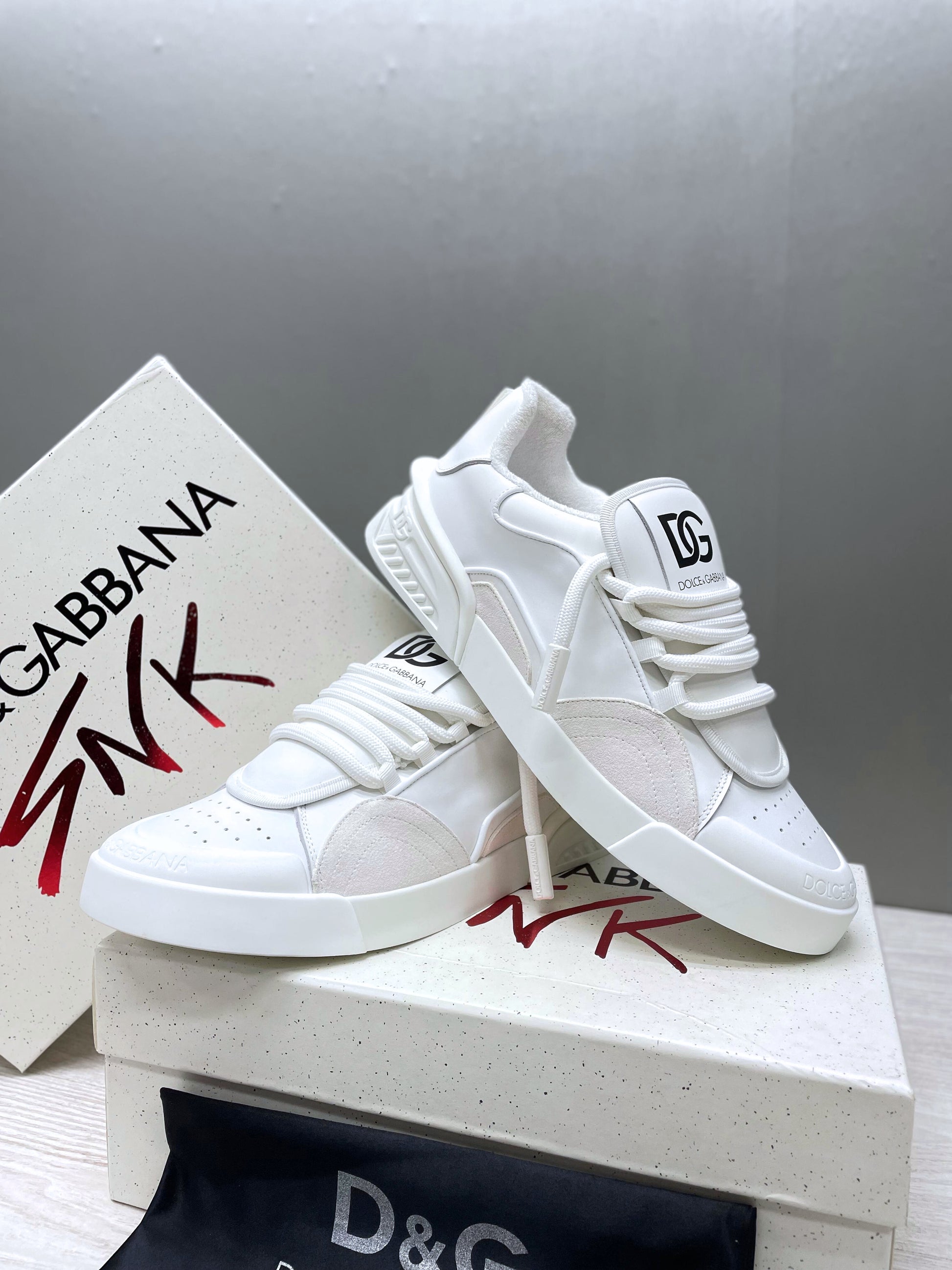 Zapatillas Dolce & Gabbana con un toque moderno acompañadas por unos gruesos cordones grabados con el nombre de la marca, una lengueta decorada con el DG también lo encontramos en la puntera, talón y suela. Incluye etiquetas, caja y bolsa guardapolvo,