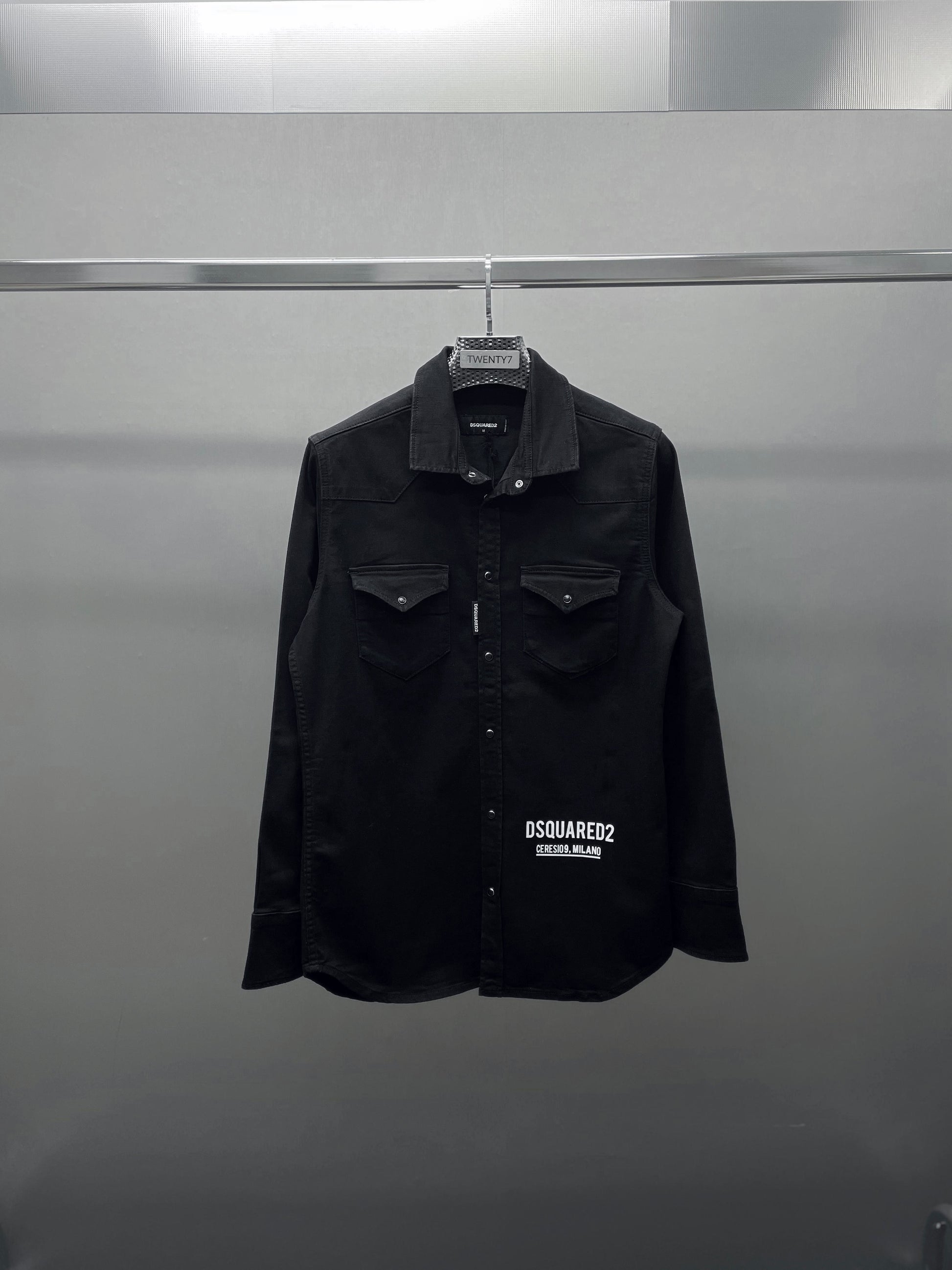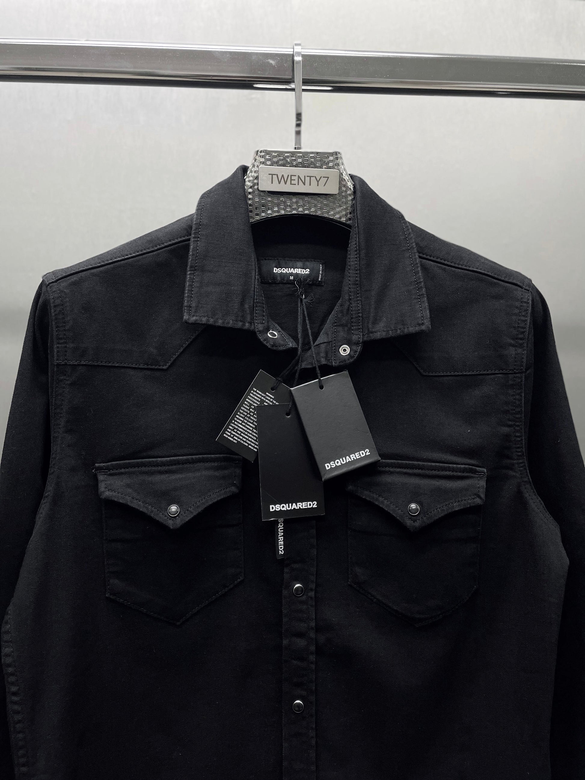 Sobrecamisa tejana en color negro con aberturas de botones y parche decorativo en el perfil.