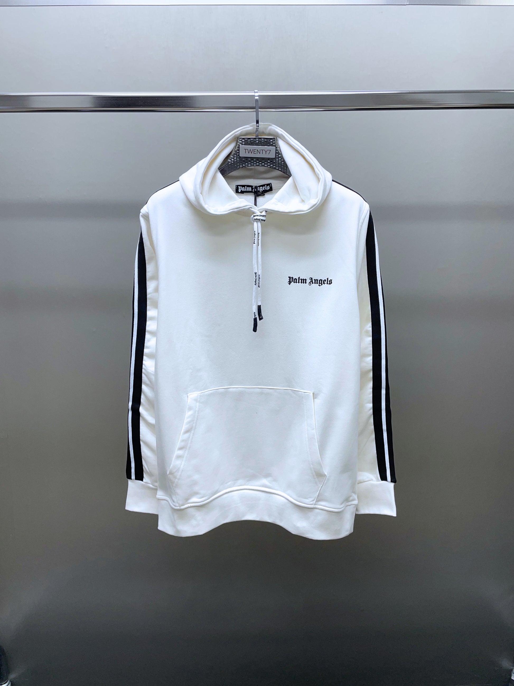 Sudadera con capucha confeccionada en suave felpa de algodón. La prenda, inspirada en ropa deportiva, está decorada con el nombre de la marca en el pectoral derecho, unas líneas que rodean los laterales de las mangas y unos cordones blancos los cuales están estampados con el nombre. El dobladillo y los puños elásticos y gruesos ayudan a mantener la sudadera en su sitio cuando te mueves y a conservar el calor cuando hace frío. Dispone de bolsillo delantero práctico para guardar objetos pequeños.
